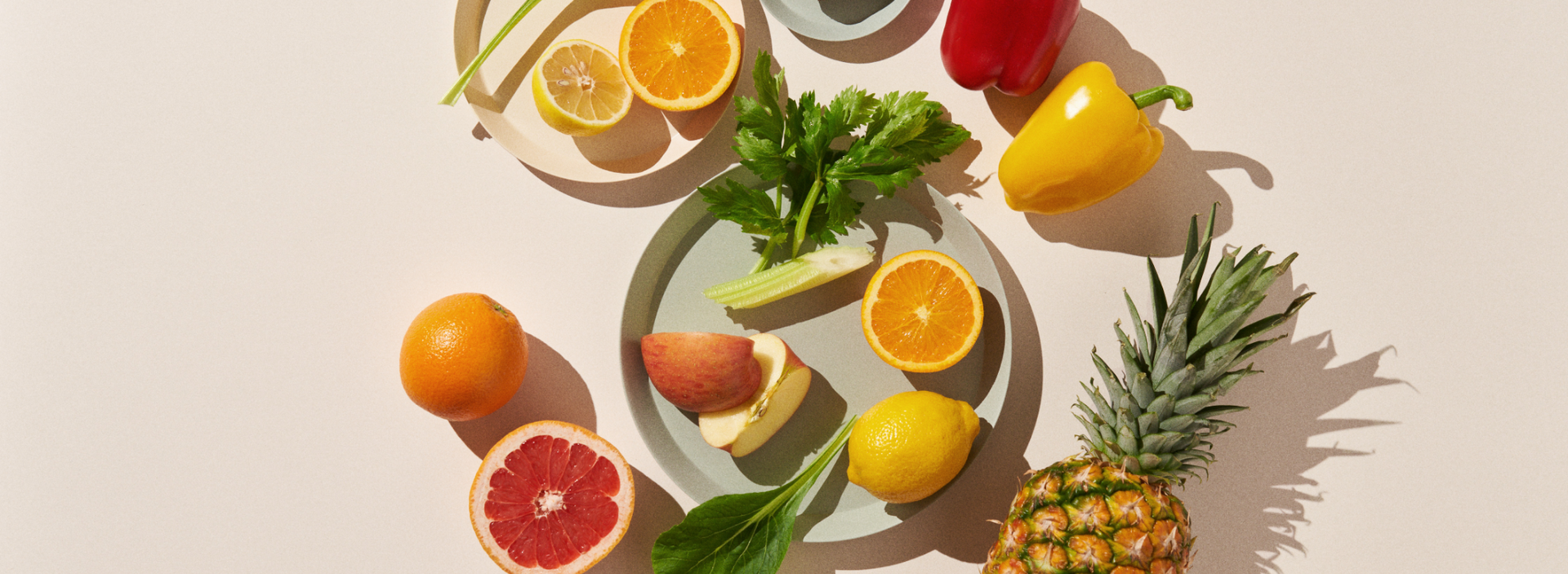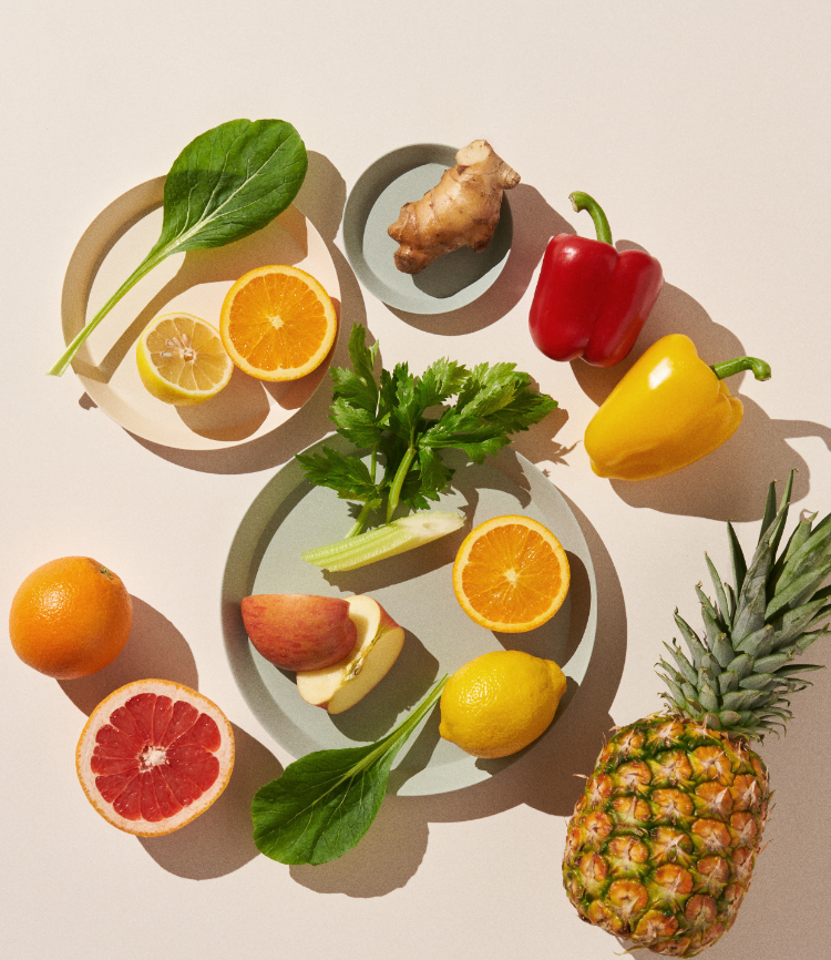 グレープフルーツ、りんご、黄色パプリカ、セロリ、パイナップル、ショウガ、キャベツ、レモン
